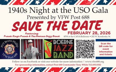 The VFW Post 688 Boerne, TX is proud to host their 1940s Night at the USO Gala, which will take place on February 28, 2026. 🎷✨