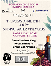 The Boost Boerne Business Networking event is Thursday April 16, from 4-6PM at Singing Water Vineyards - 316 Mill Dam Rd. Comfort