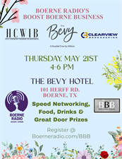 The Boost Boerne Business Networking event is Thursday, May 21, from 4-6PM at The Bevy Hotel. - 101 Herff Rd. Boerne, TX 78006