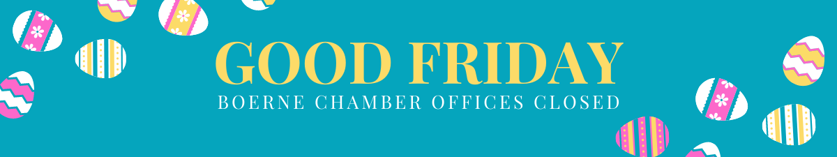 The Greater Boerne Chamber of Commerce will be closed on Friday, April 3 and Monday, April 6 in observance of Good Friday and Easter Monday. The Chamber will reopen on Tuesday, April 7 at 9:00 am.