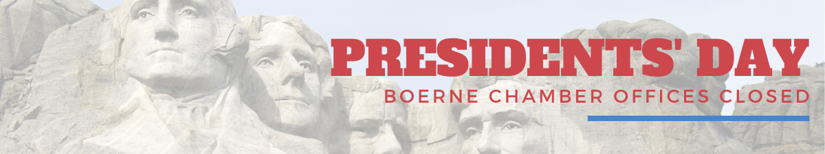 The Greater Boerne Chamber of Commerce will be closed on Monday, February 16 in observance of Presidents' Day. The Chamber will reopen on Tuesday, February 17 at 9:00 am.