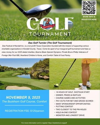 Das Festival of Kendall is excited to host their 2nd Annual Golf Tournament at The Buckhorn Golf Course in Comfort, TX on Sunday, November 9, 2025.