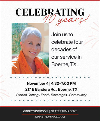 Join us for an evening of celebration as Ginny Thompson State Farm marks a major milestone – its 40th anniversary-with a special ribbon-cutting ceremony. Ginny and her team extend a warm invitation to join them for an evening of food, drinks, and festivities, honoring 40 years of tireless dedication to serving the Boerne Community. The Thompson Agency remains steadfast in its commitment to providing a broad spectrum of insurance and financial solutions. Ginny’s areas of expertise include asset protection, income protection, wealth management, and distribution. They look forward to celebrating this remarkable 40-year milestone with you!